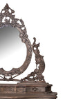 solid wood with detailed carvings and an elegant oval mirror.